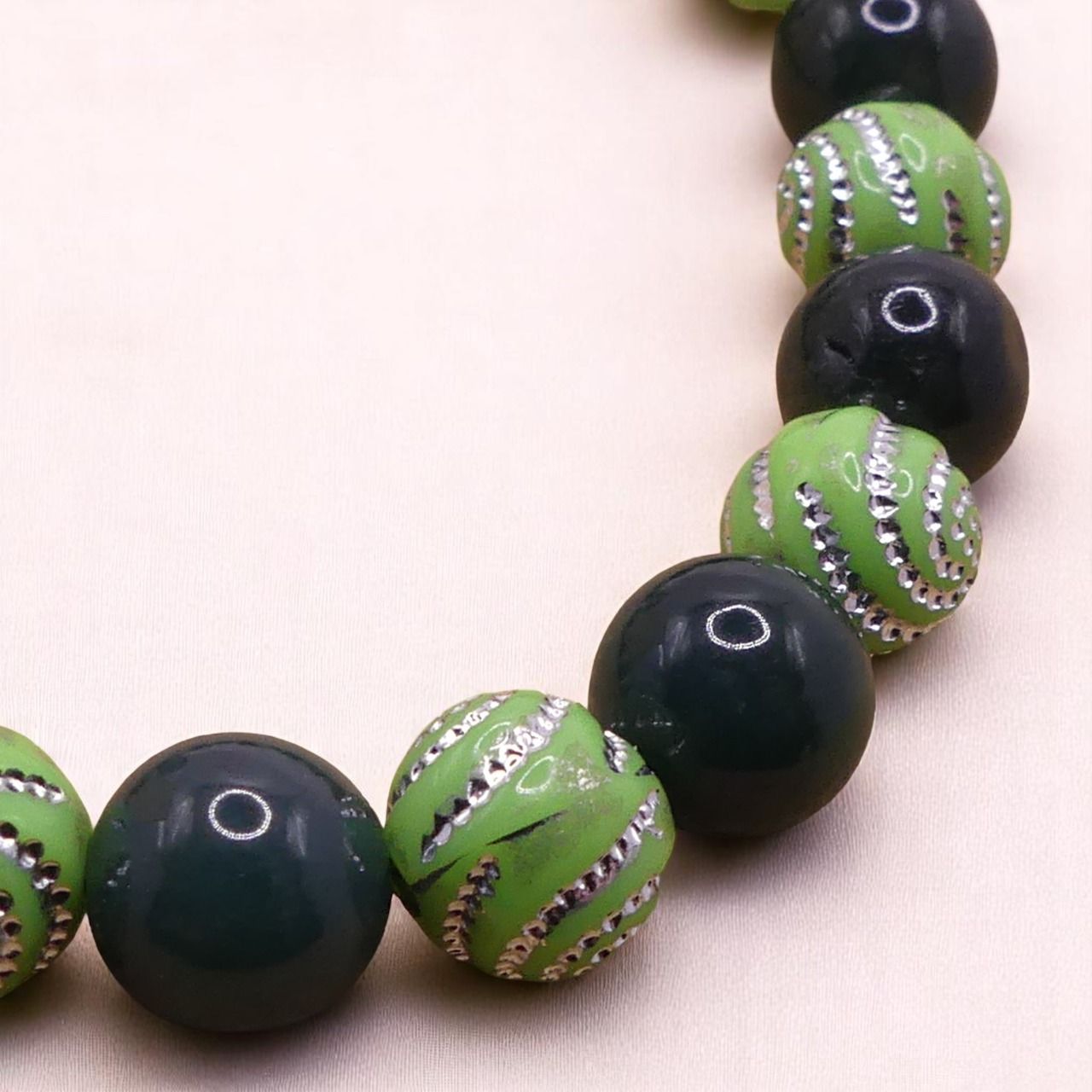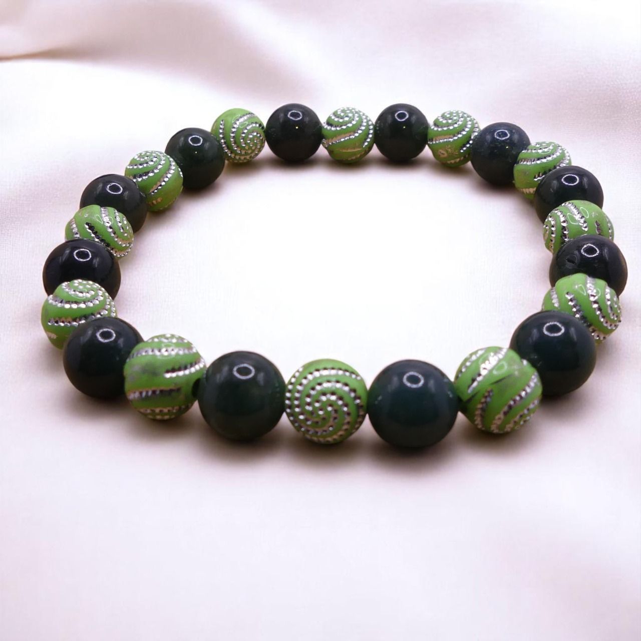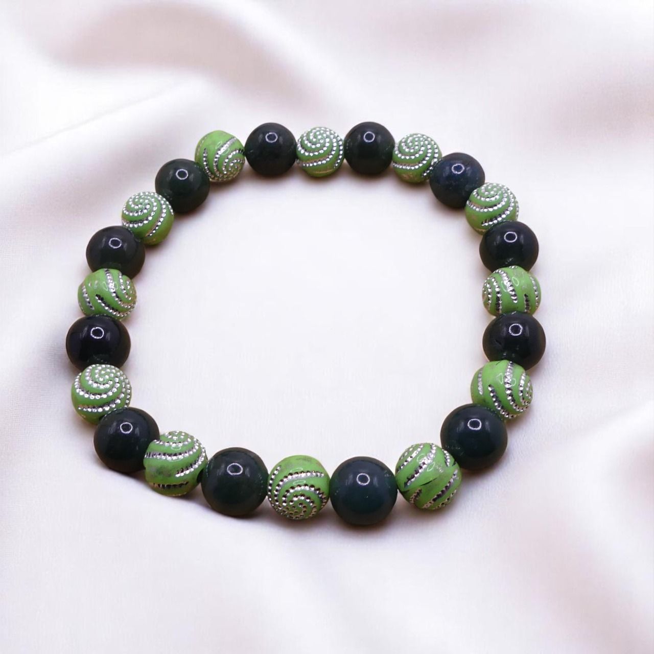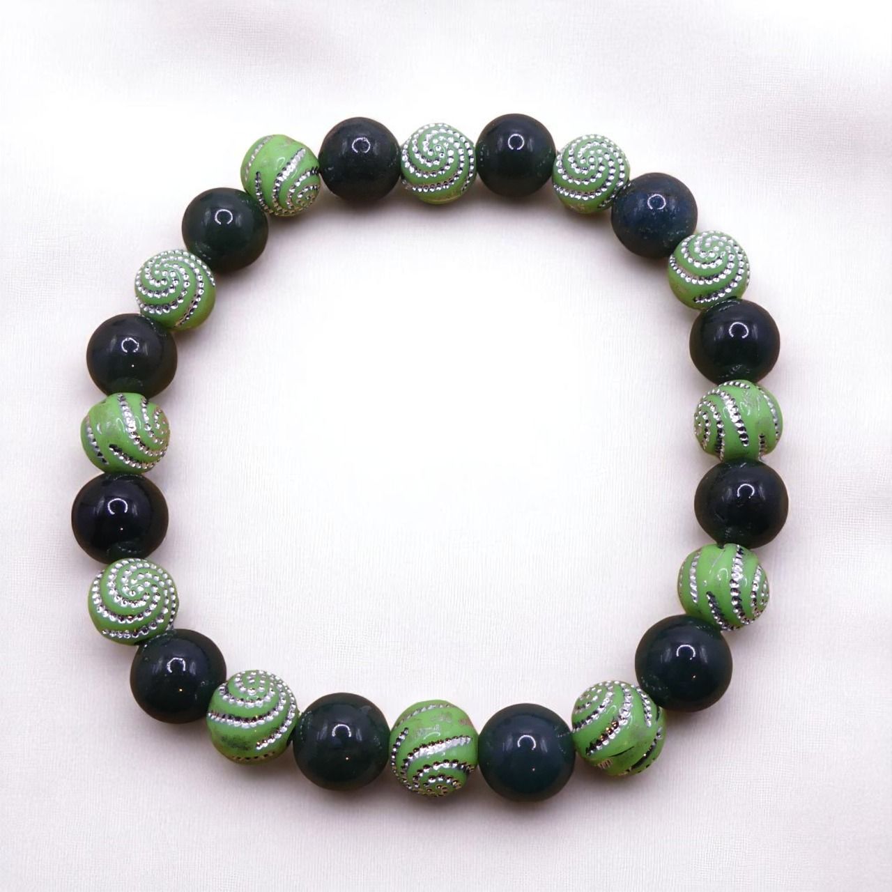 Ce bracelet en perles ronde 8 mm de diamètre est monté sur un fil élastique résistant.