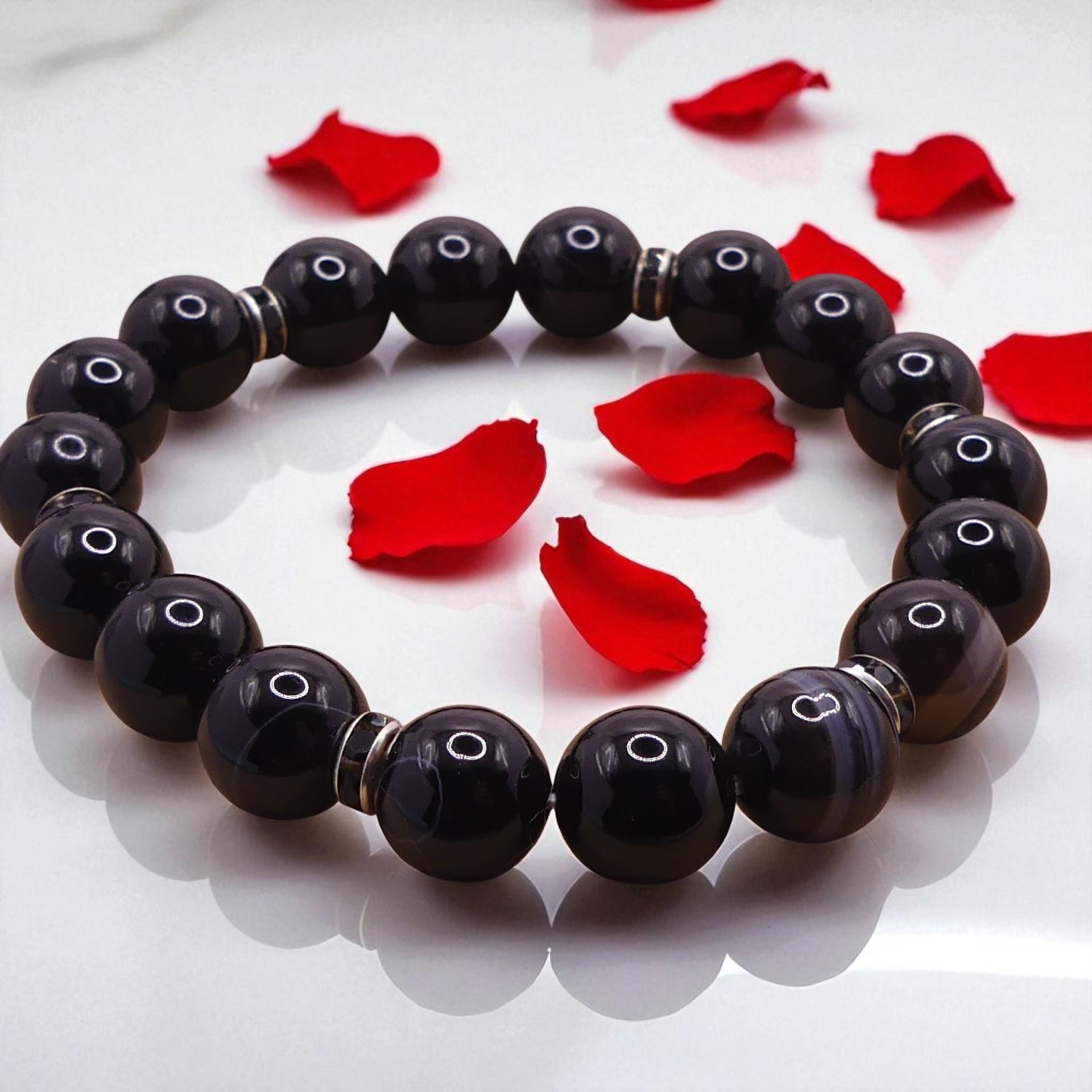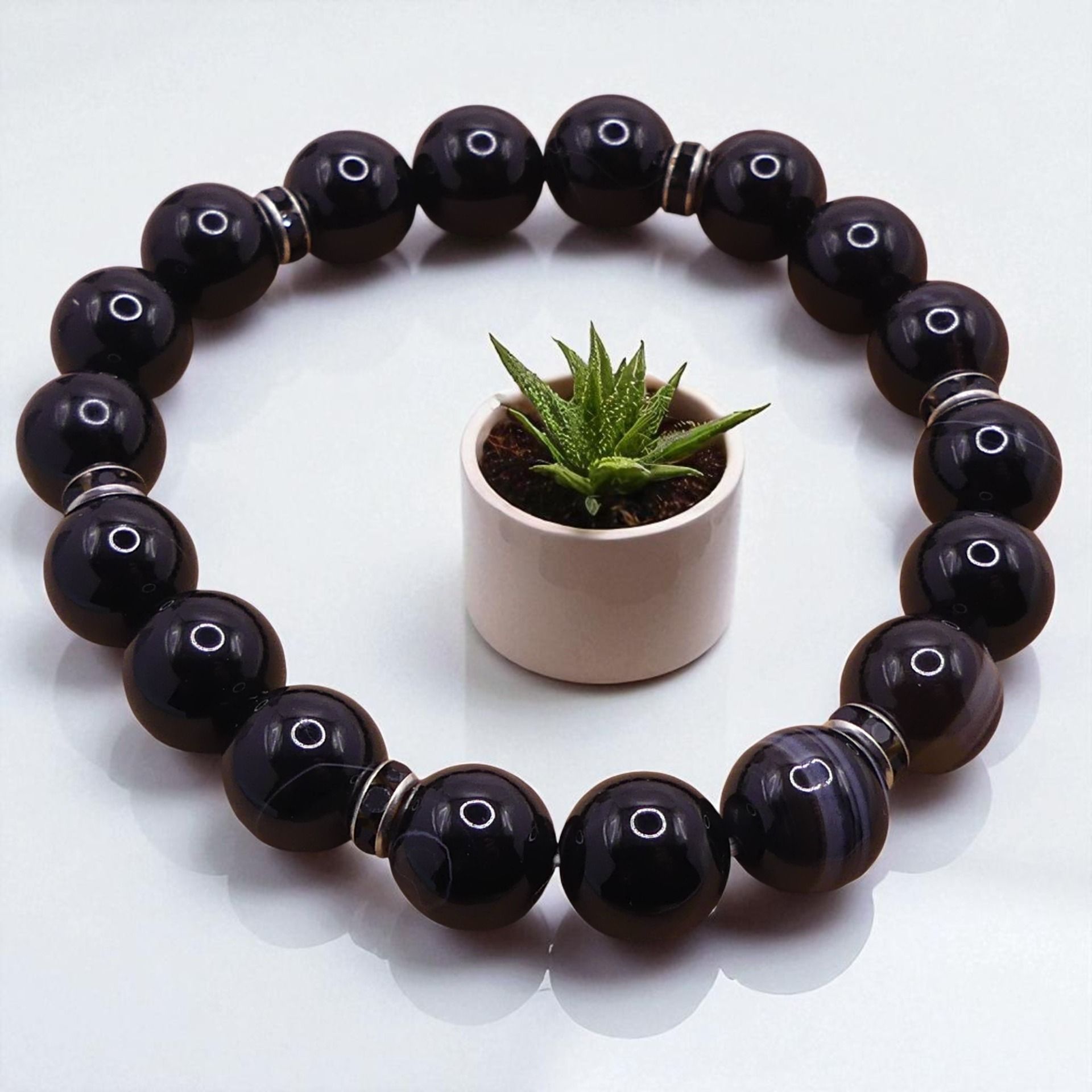 l’Agate Noire est la pierre de protection par excellence. Idéale pour s’ancrer dans le présent, cette gemme sombre apaise les émotions les plus tumultueuses pour un retour au calme et à la sérénité