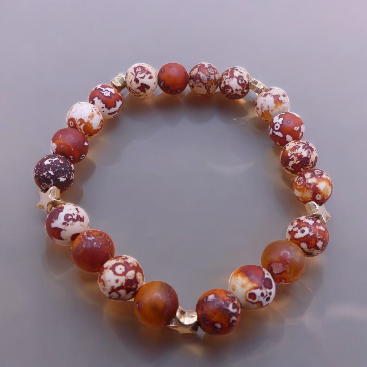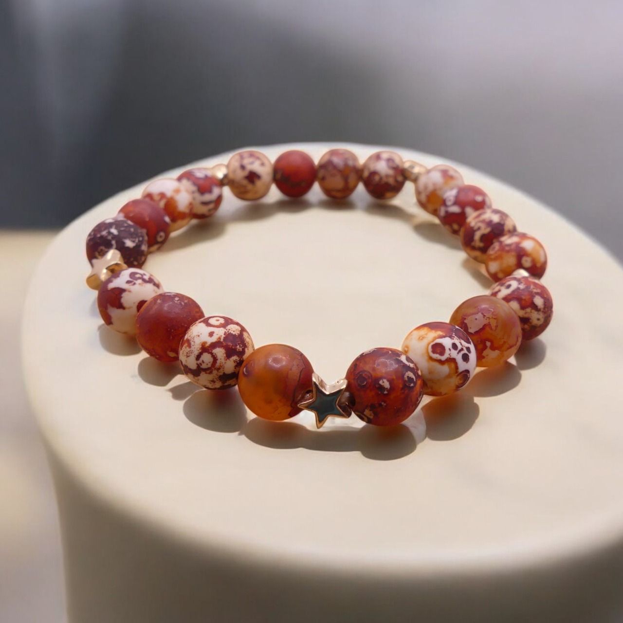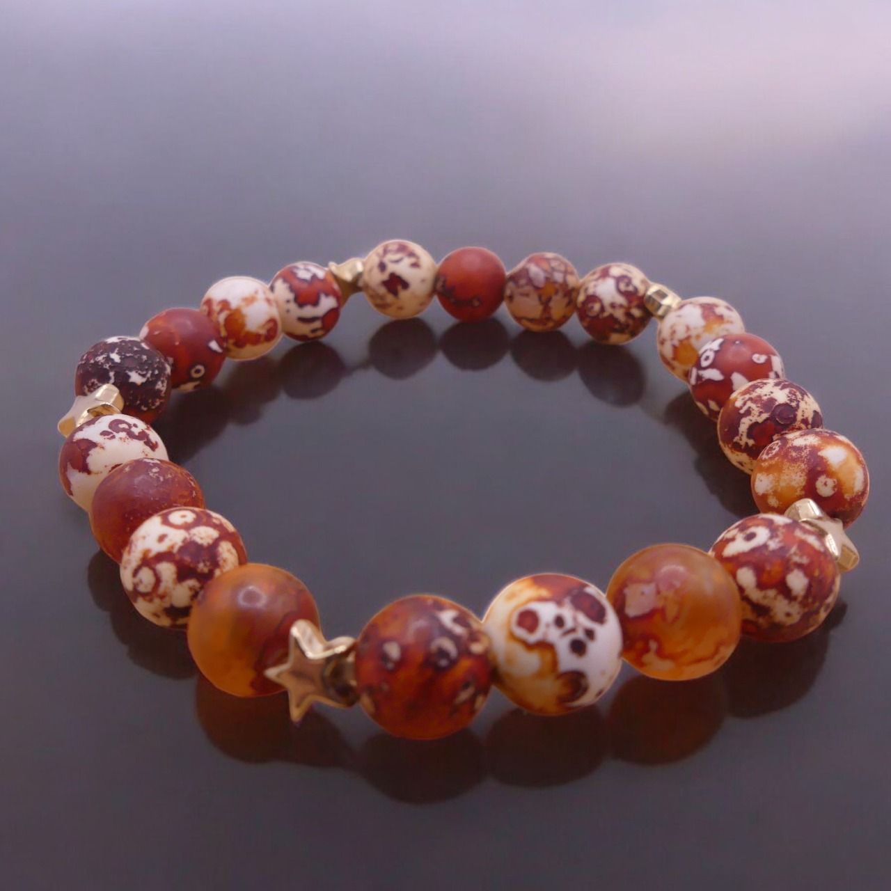 Ce bracelet en perles ronde 8 mm de diamètre est monté sur un fil élastique résistant.