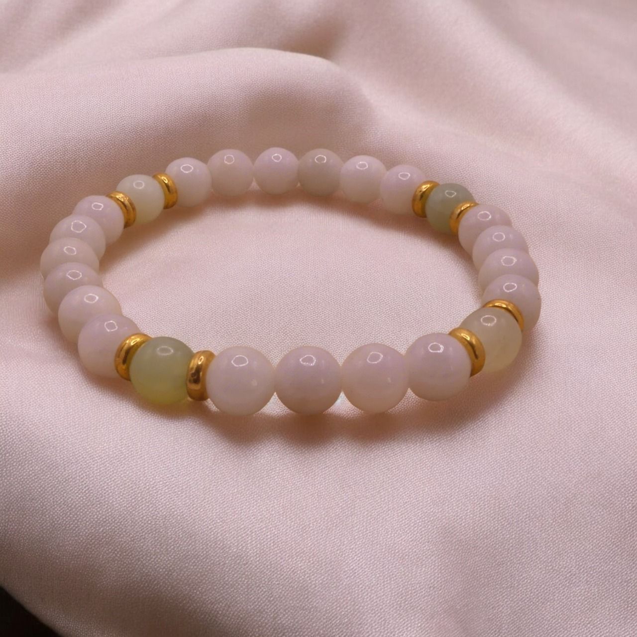 Ce bracelet en perles ronde 8 mm de diamètre est monté sur un fil élastique résistant.
