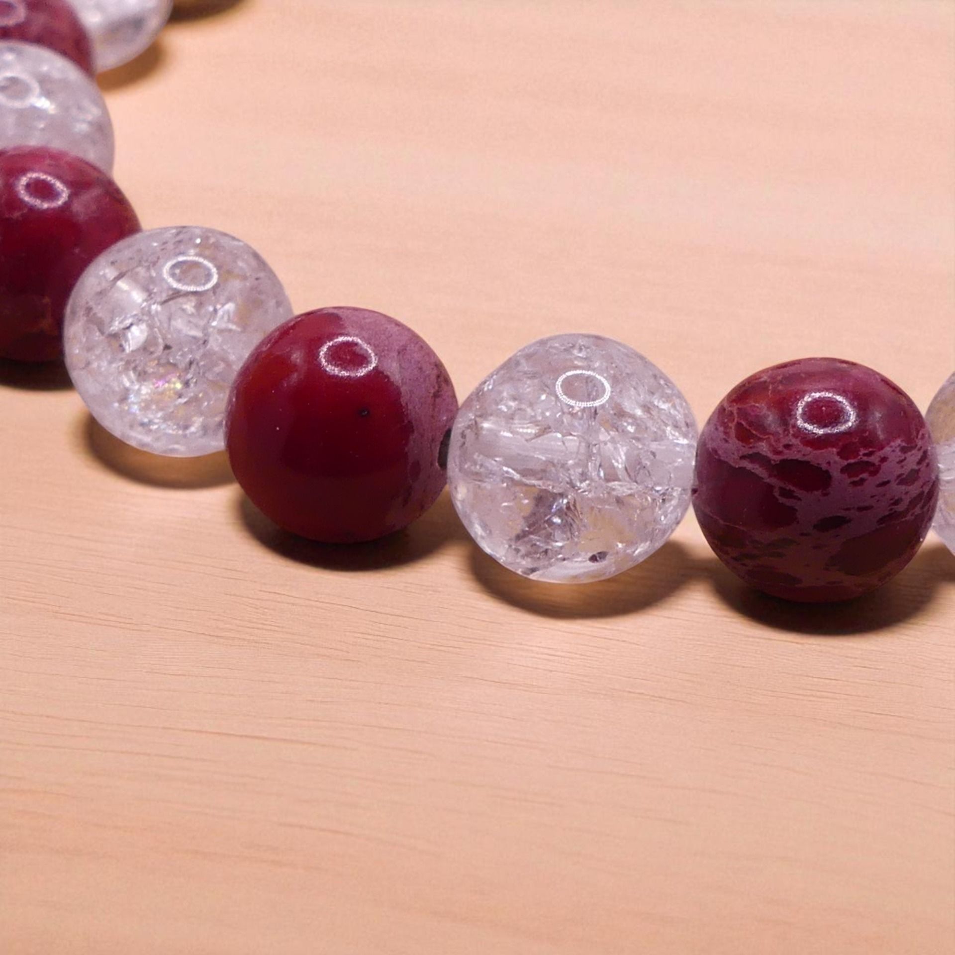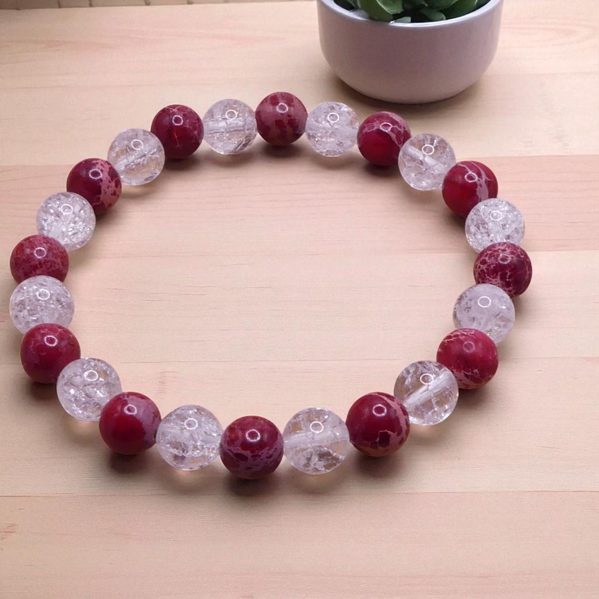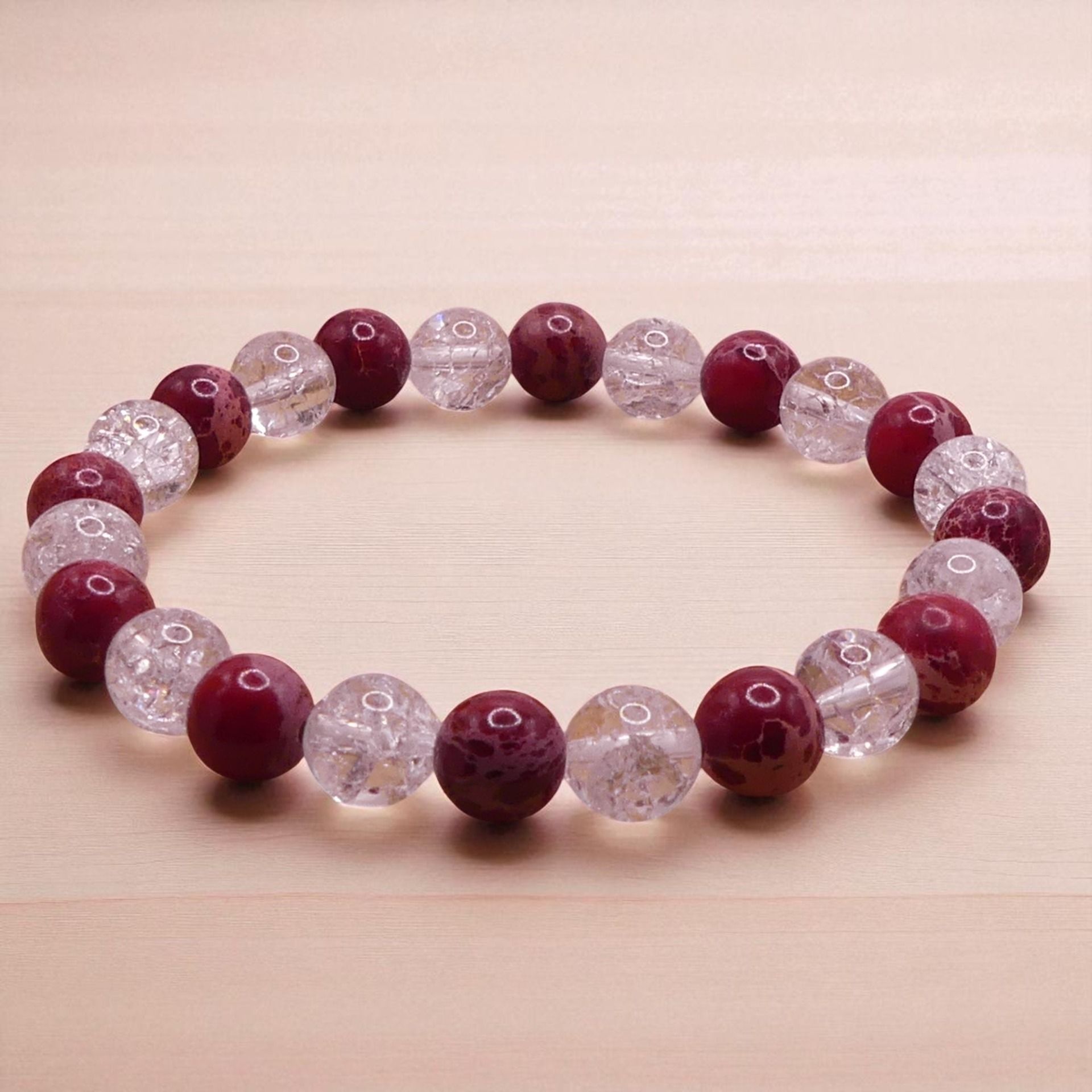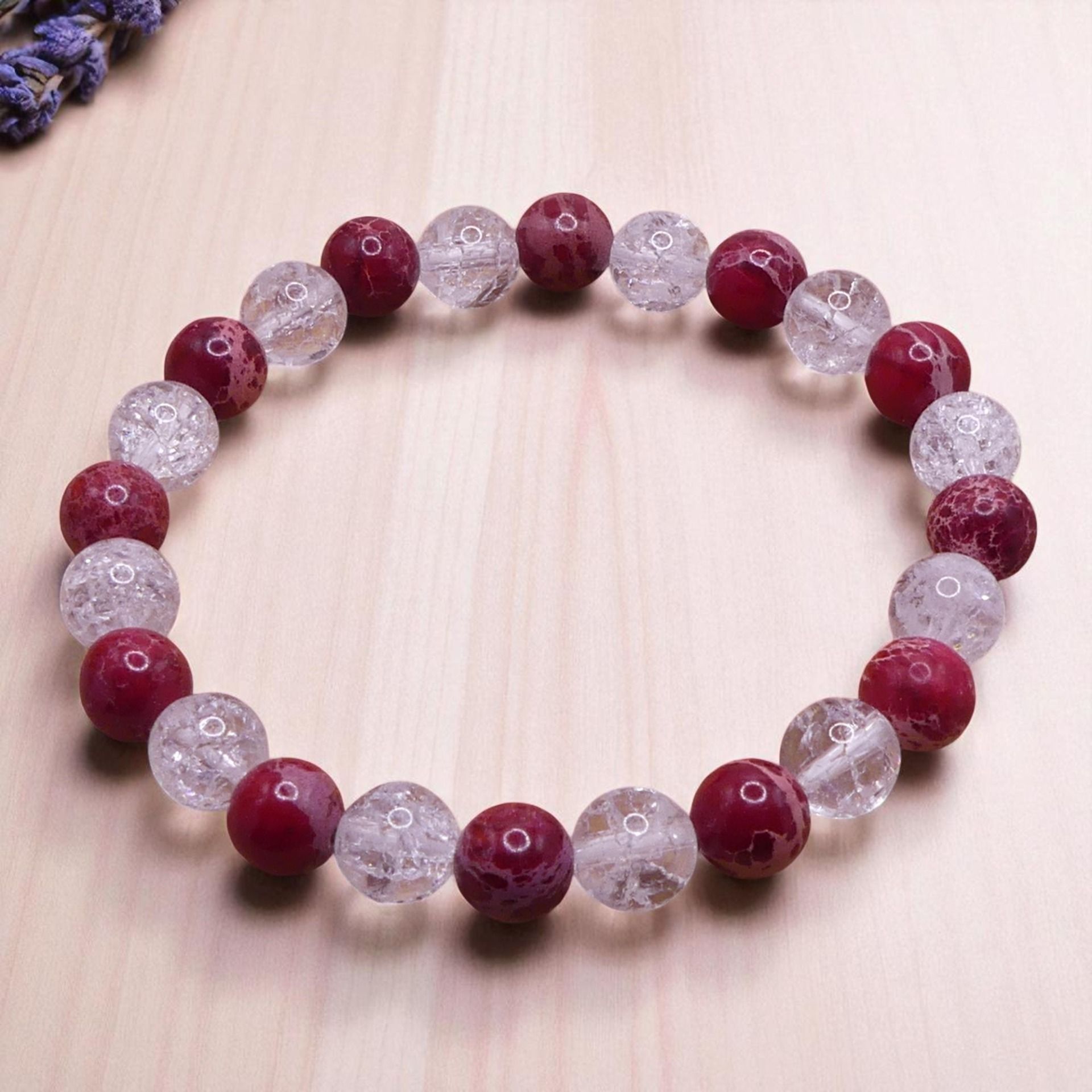 Ce bracelet en perles ronde 8 mm de diamètre est monté sur un fil élastique résistant.