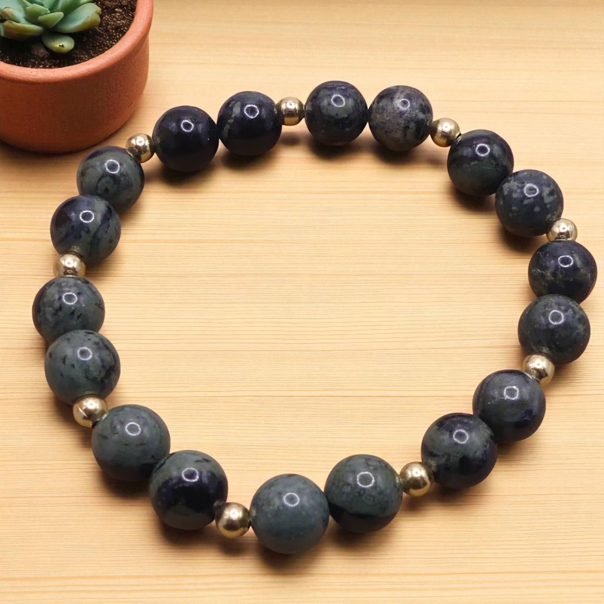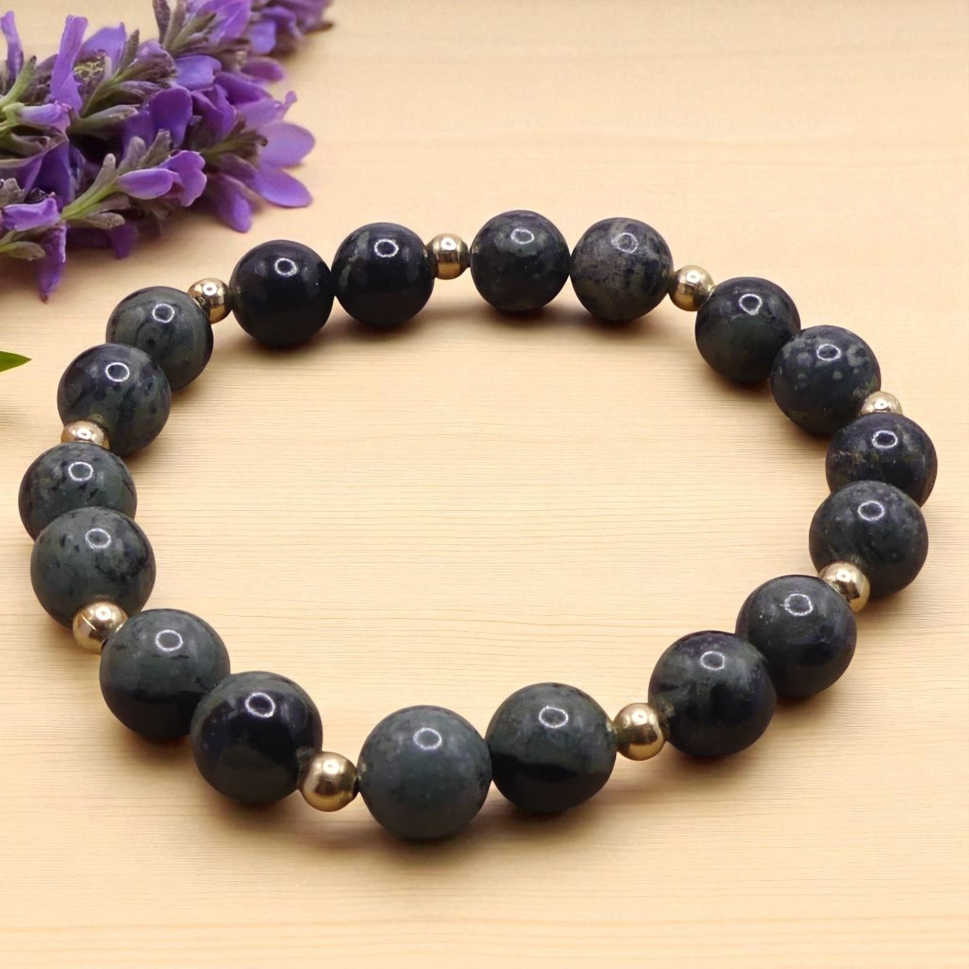 Ce bracelet en perles ronde 8 mm de diamètre est monté sur un fil élastique résistant.