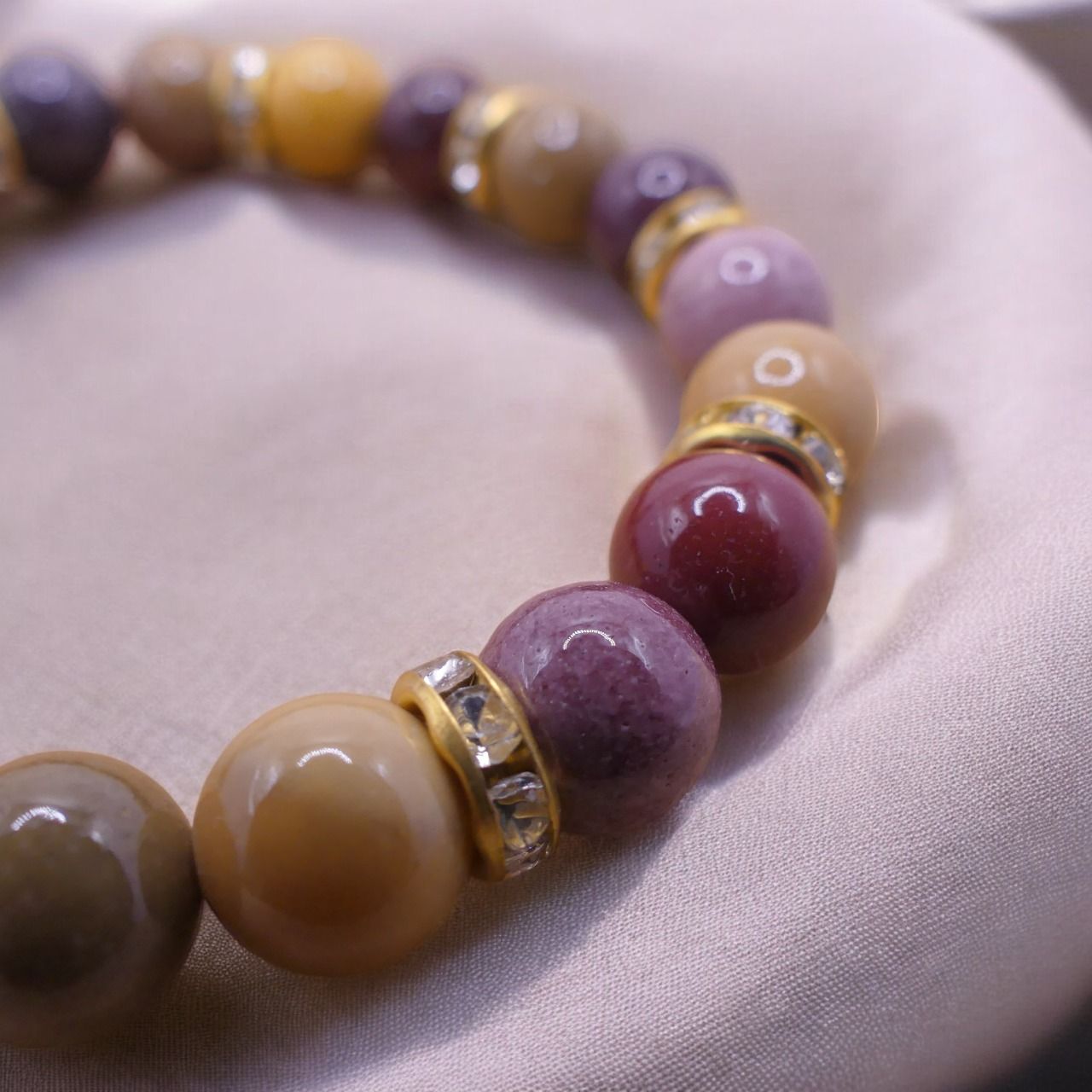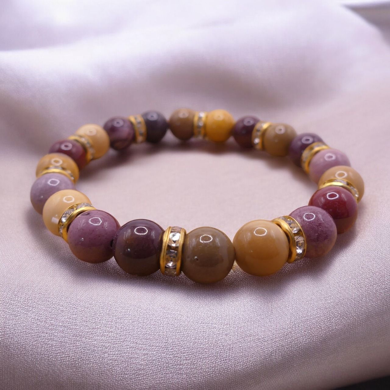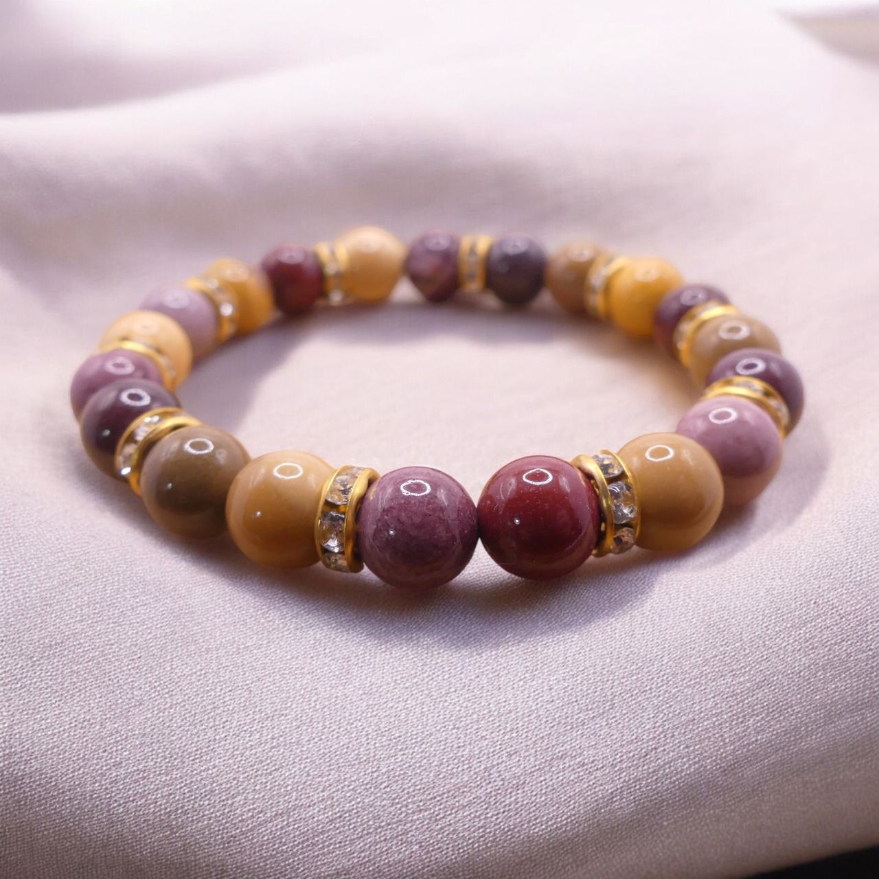 Le Jaspe Mokaïte est une pierre multicolore à majorité de jaune moutarde, bordeaux, marron ou crème. Cette opale particulière est un radiolaire calcédonieux (roche contenant des restes microscopiques de protozoaires) originaire de Mooka Creek, en Australie. Mooka est un mot aborigène qui signifie « eaux vives ».
