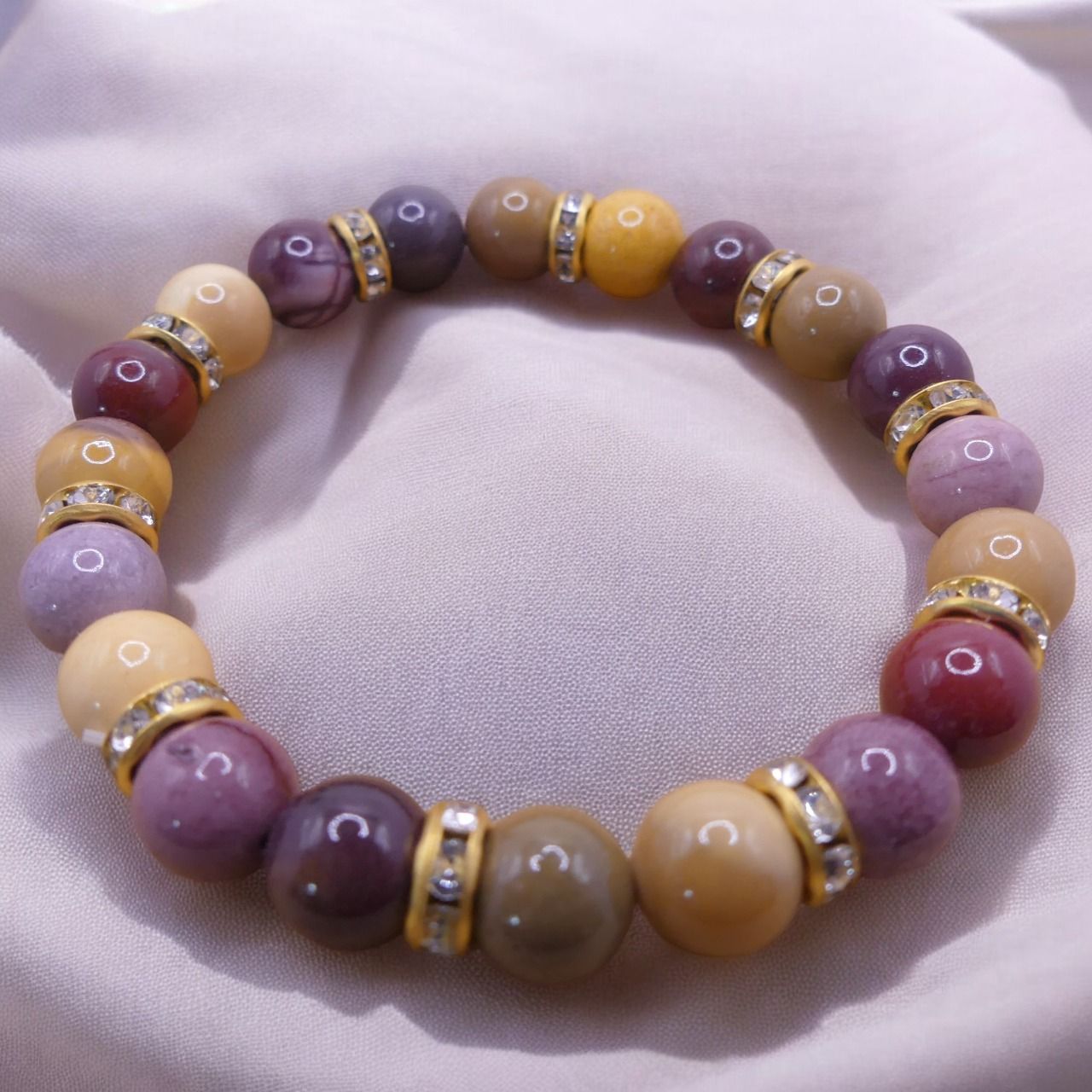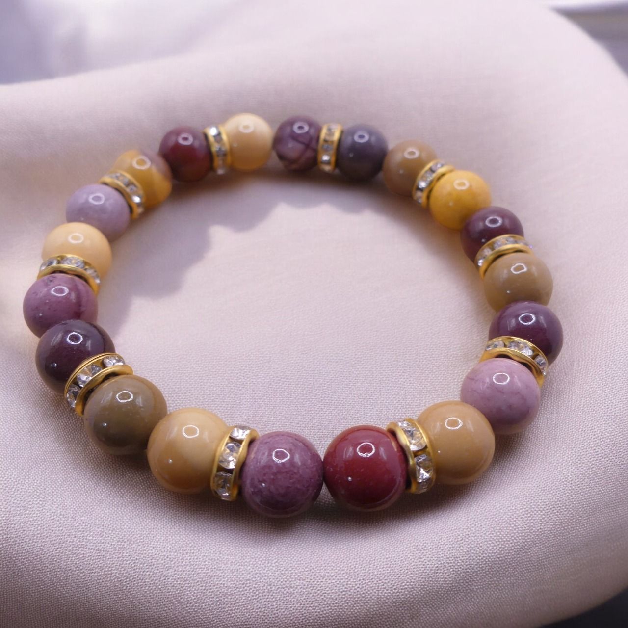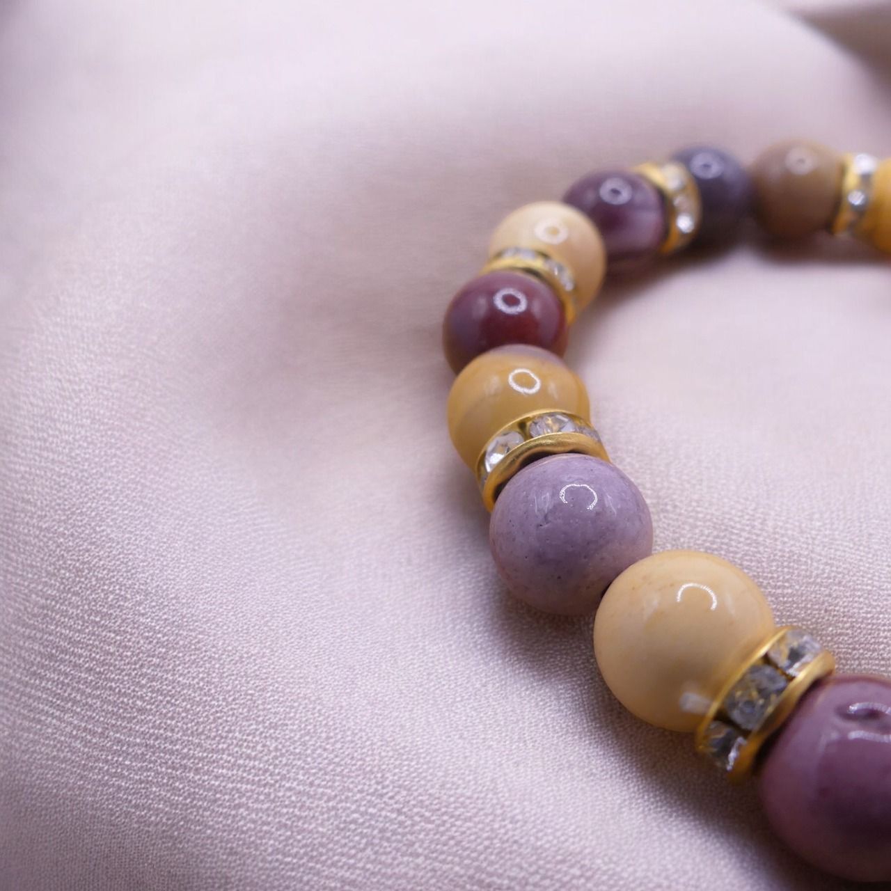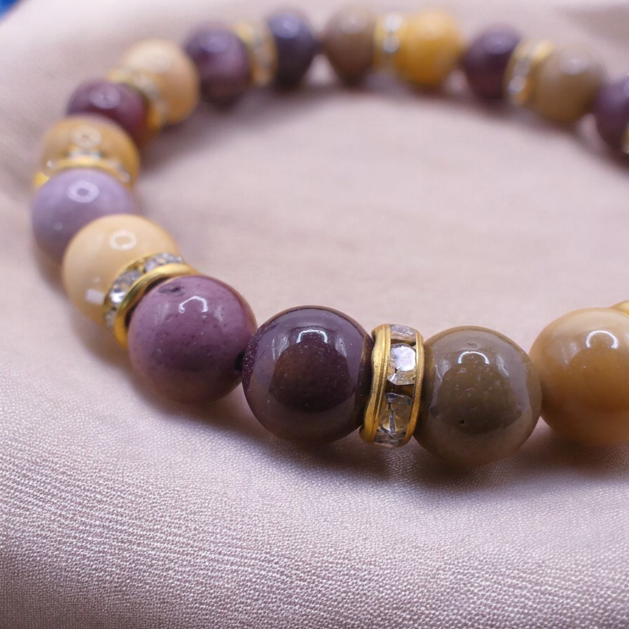 Le Jaspe Mokaïte est une pierre multicolore à majorité de jaune moutarde, bordeaux, marron ou crème. Cette opale particulière est un radiolaire calcédonieux (roche contenant des restes microscopiques de protozoaires) originaire de Mooka Creek, en Australie. Mooka est un mot aborigène qui signifie « eaux vives ».
