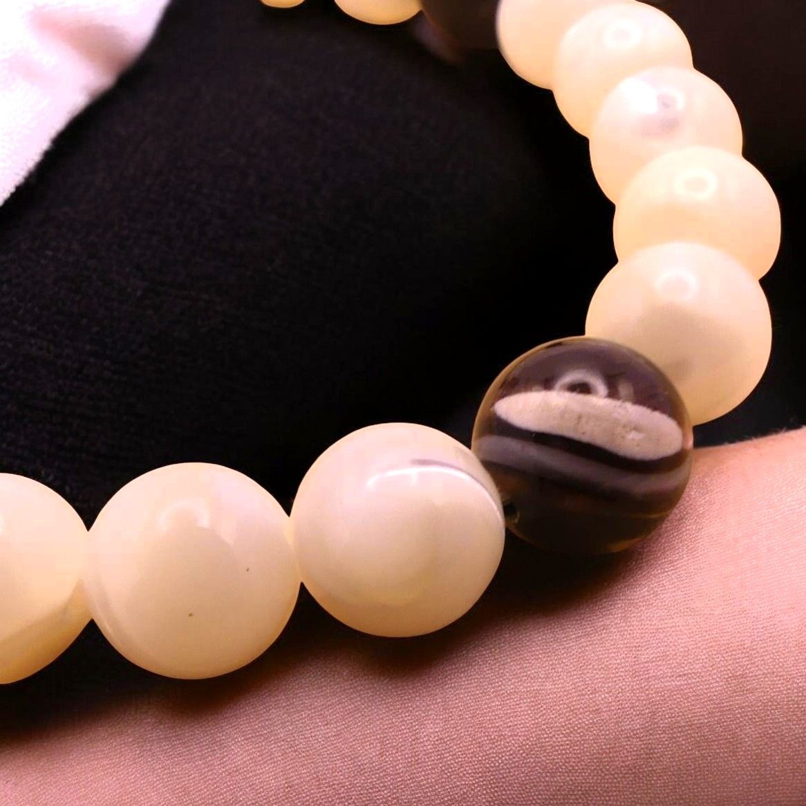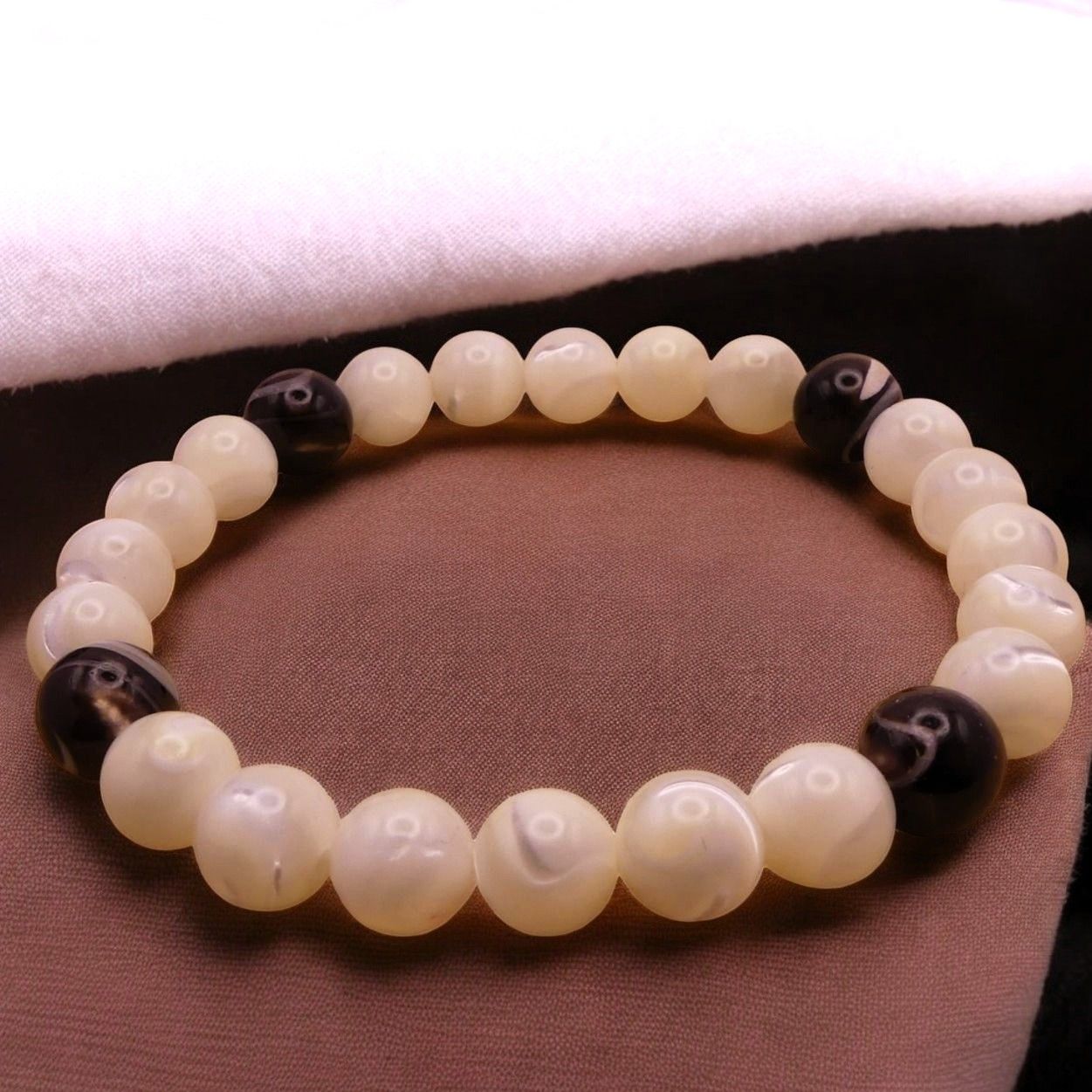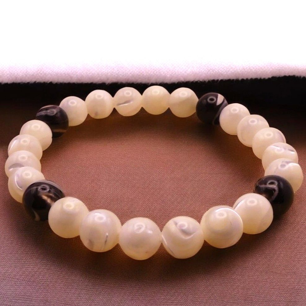 Ce bracelet en perles ronde 8 mm de diamètre est monté sur un fil élastique résistant.