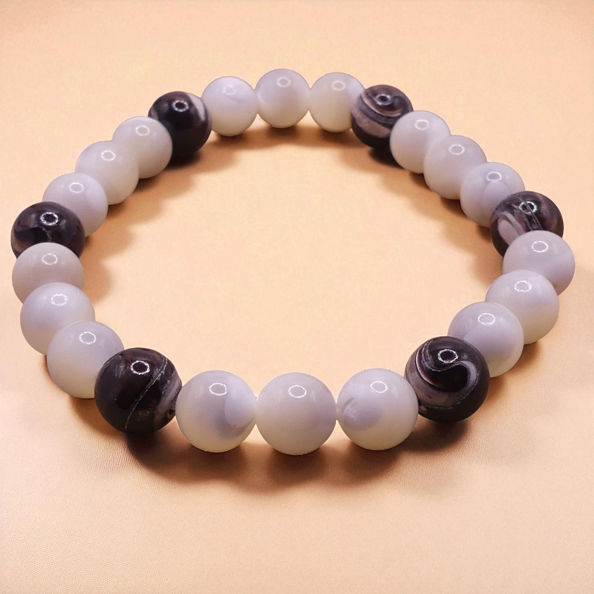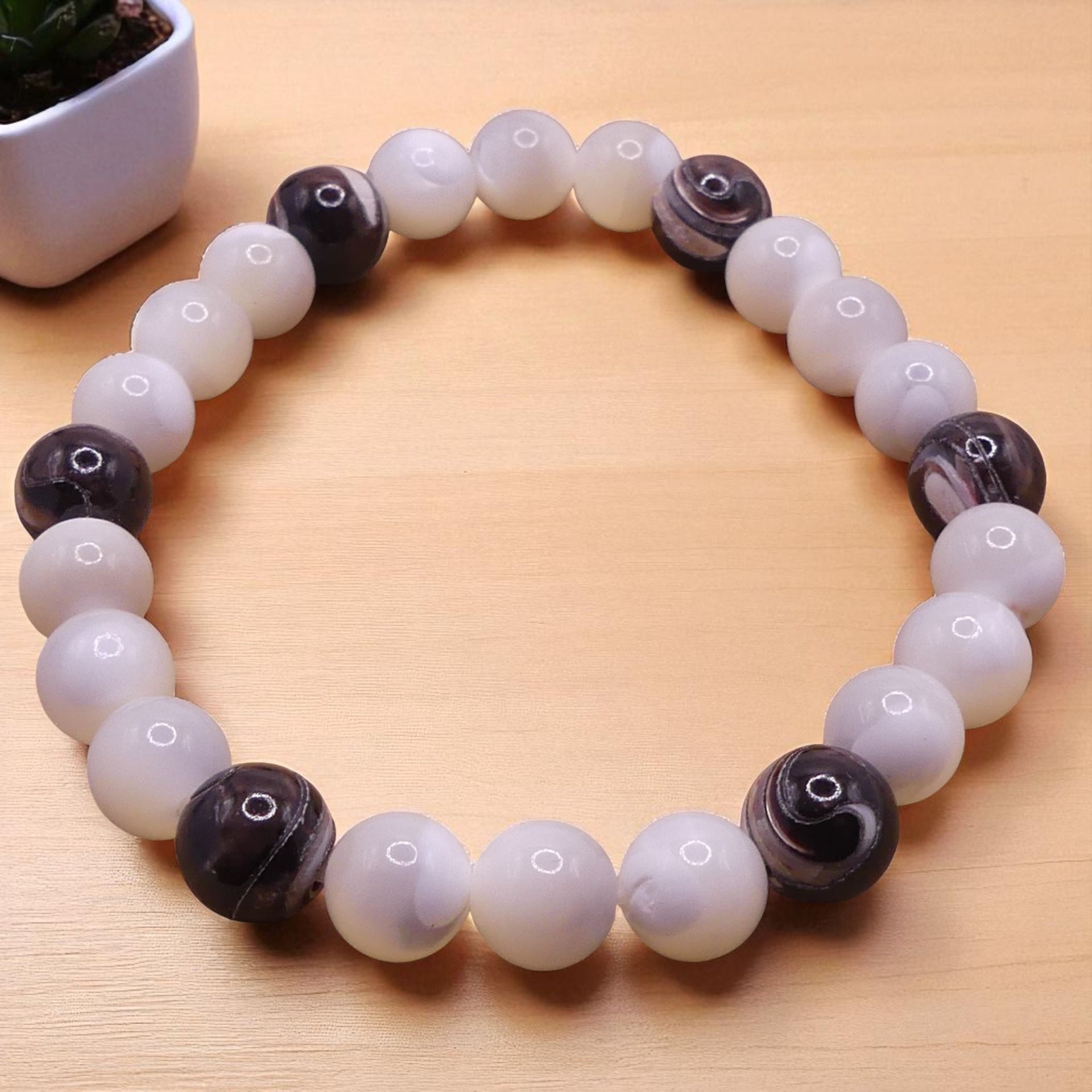 Ce bracelet en perles ronde 8 mm de diamètre est monté sur un fil élastique résistant.
