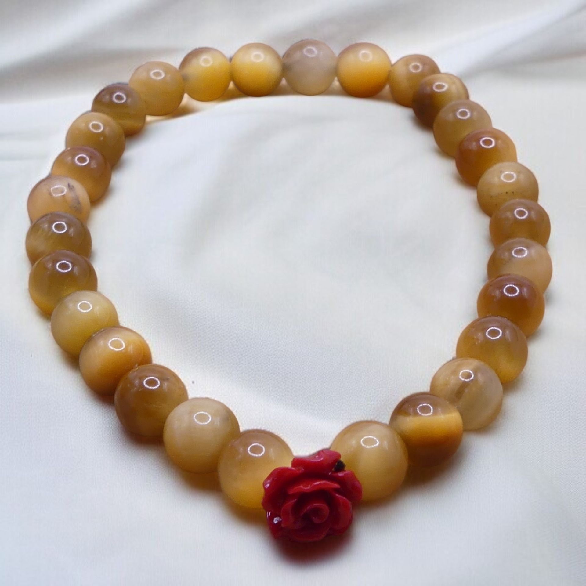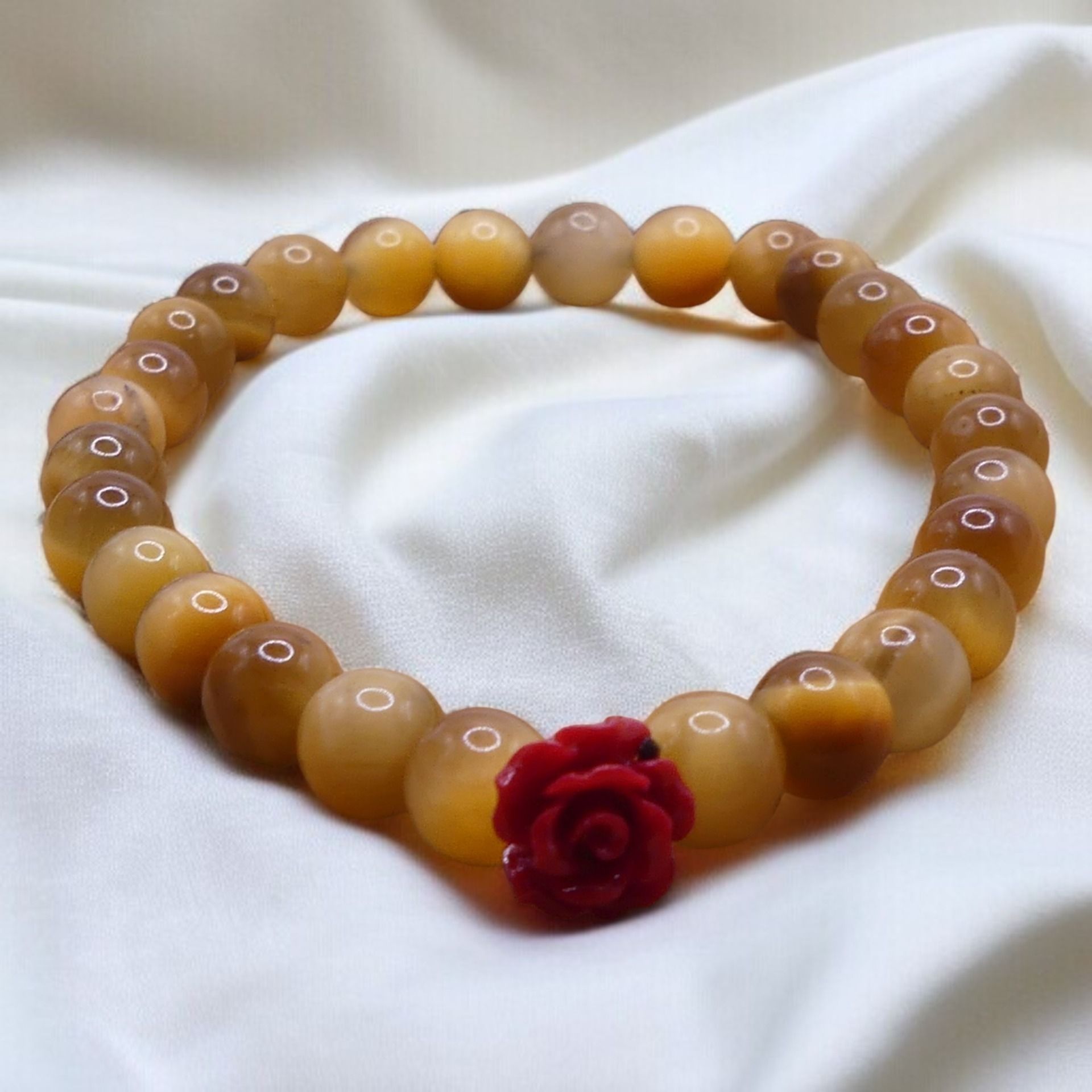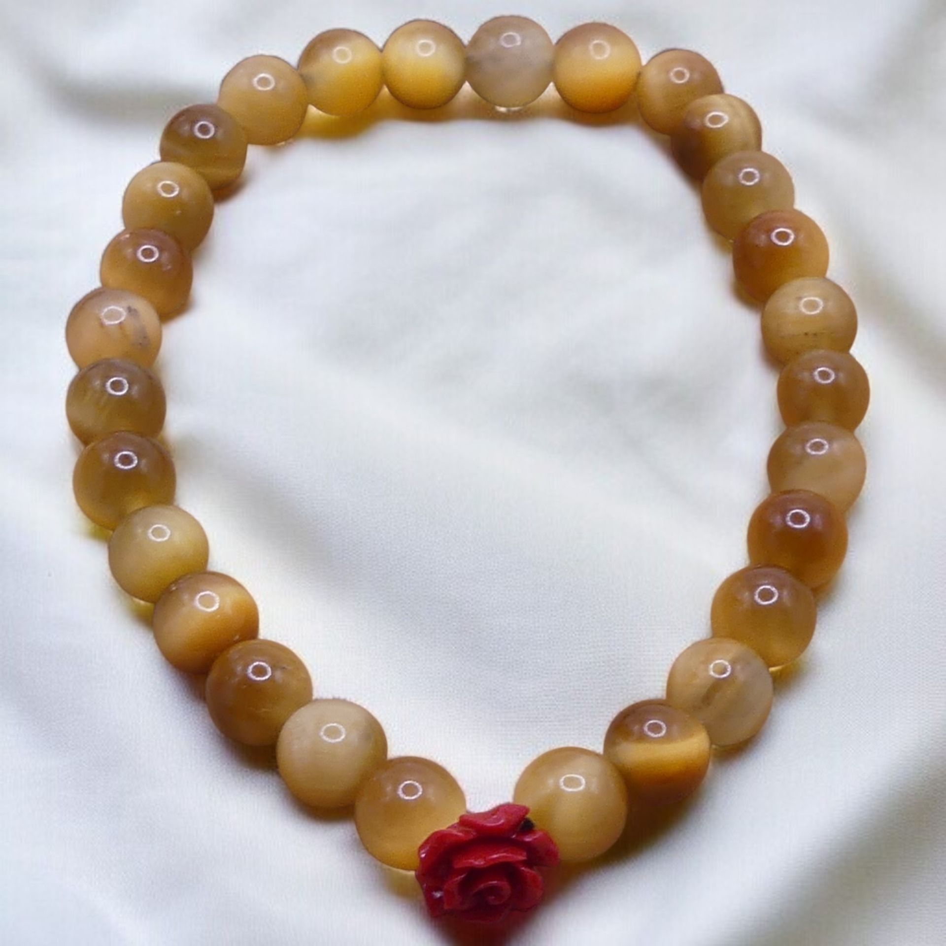 Ce bracelet est monté sur un fil élastique résistant avec des perles ronde 6 mm et une breloque en résine en forme de rose .