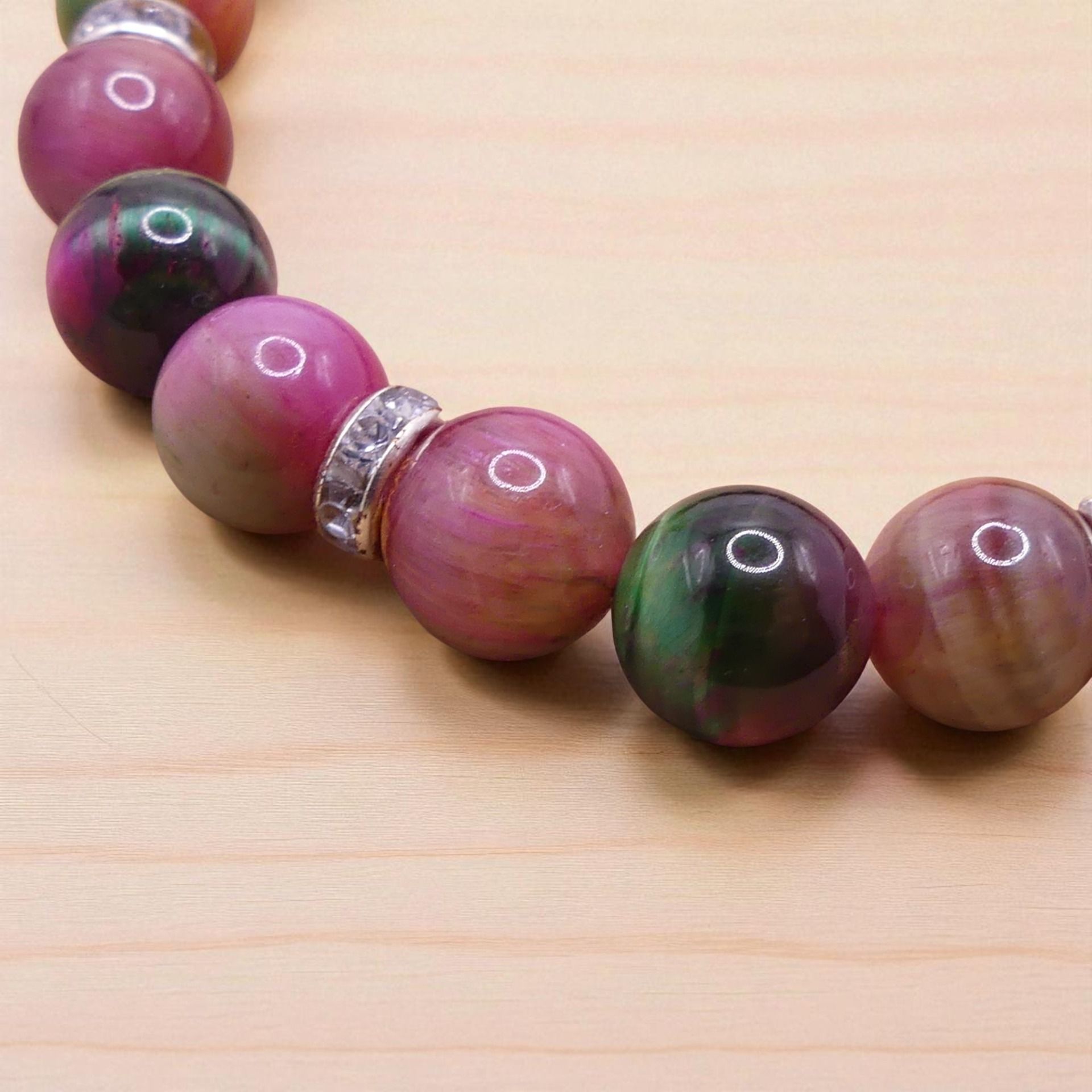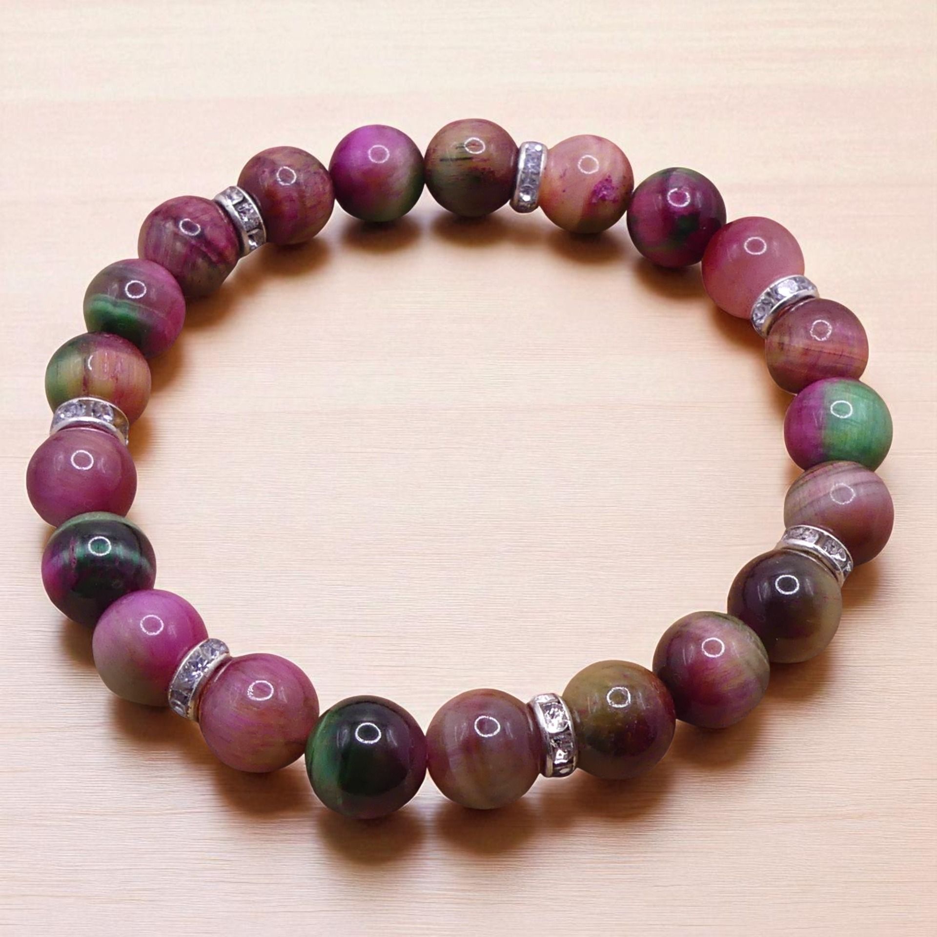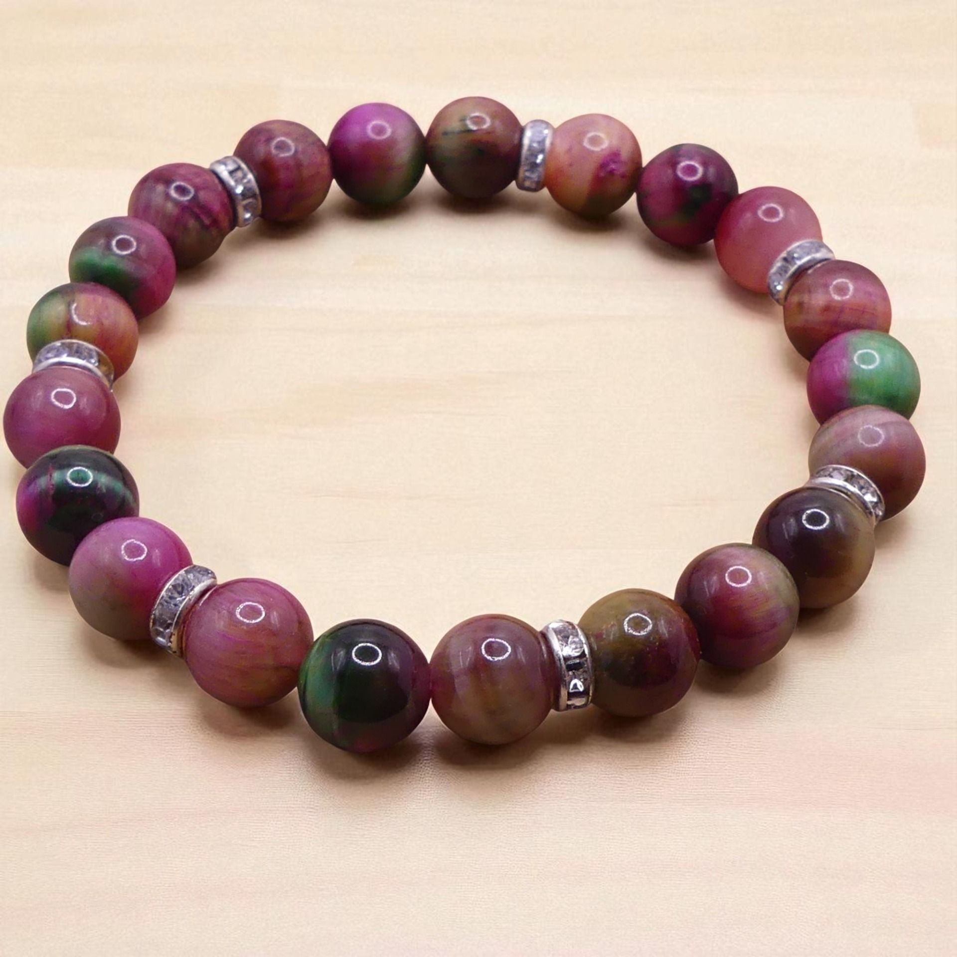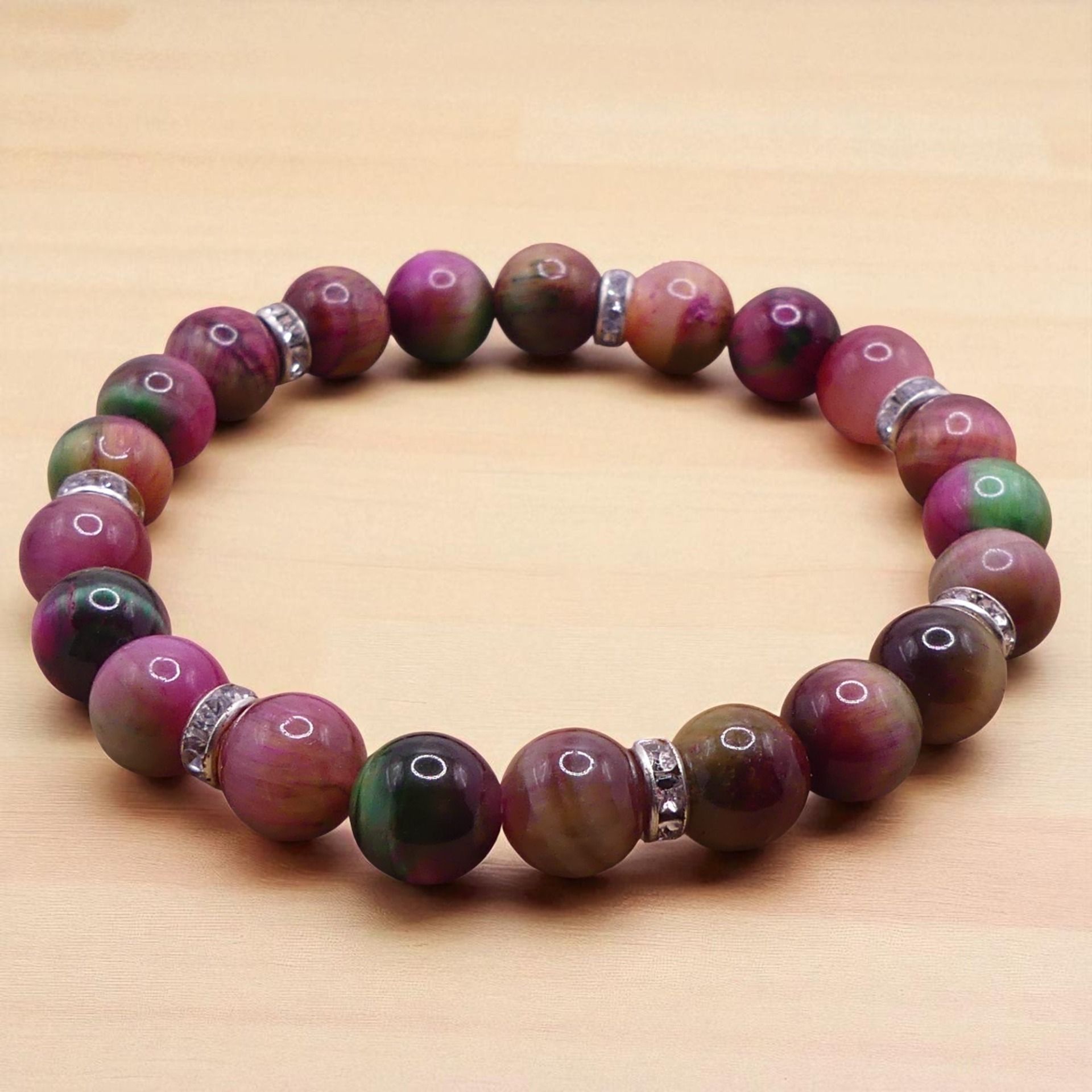 Ce bracelet en perles ronde 8 mm de diamètre est monté sur un fil élastique résistant.