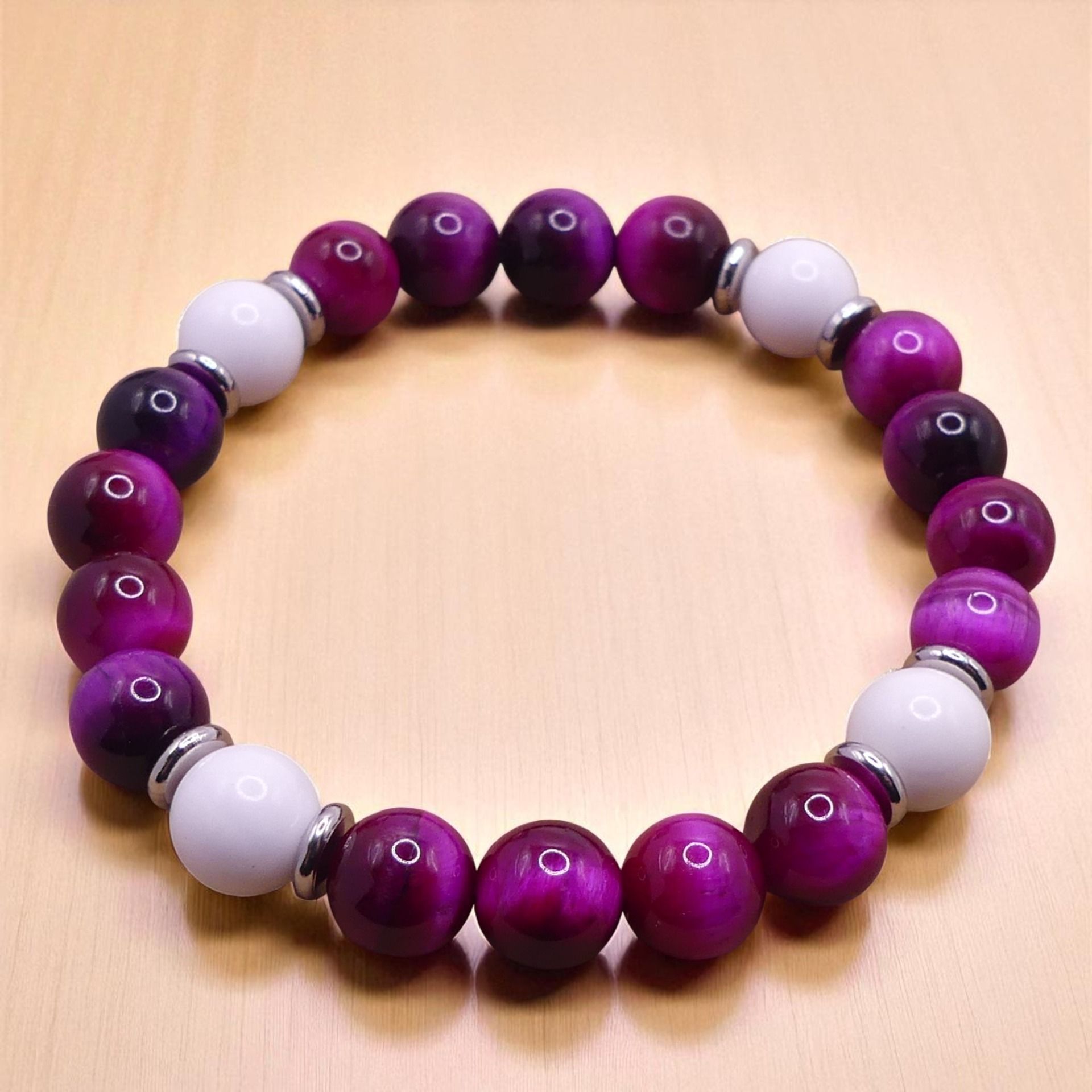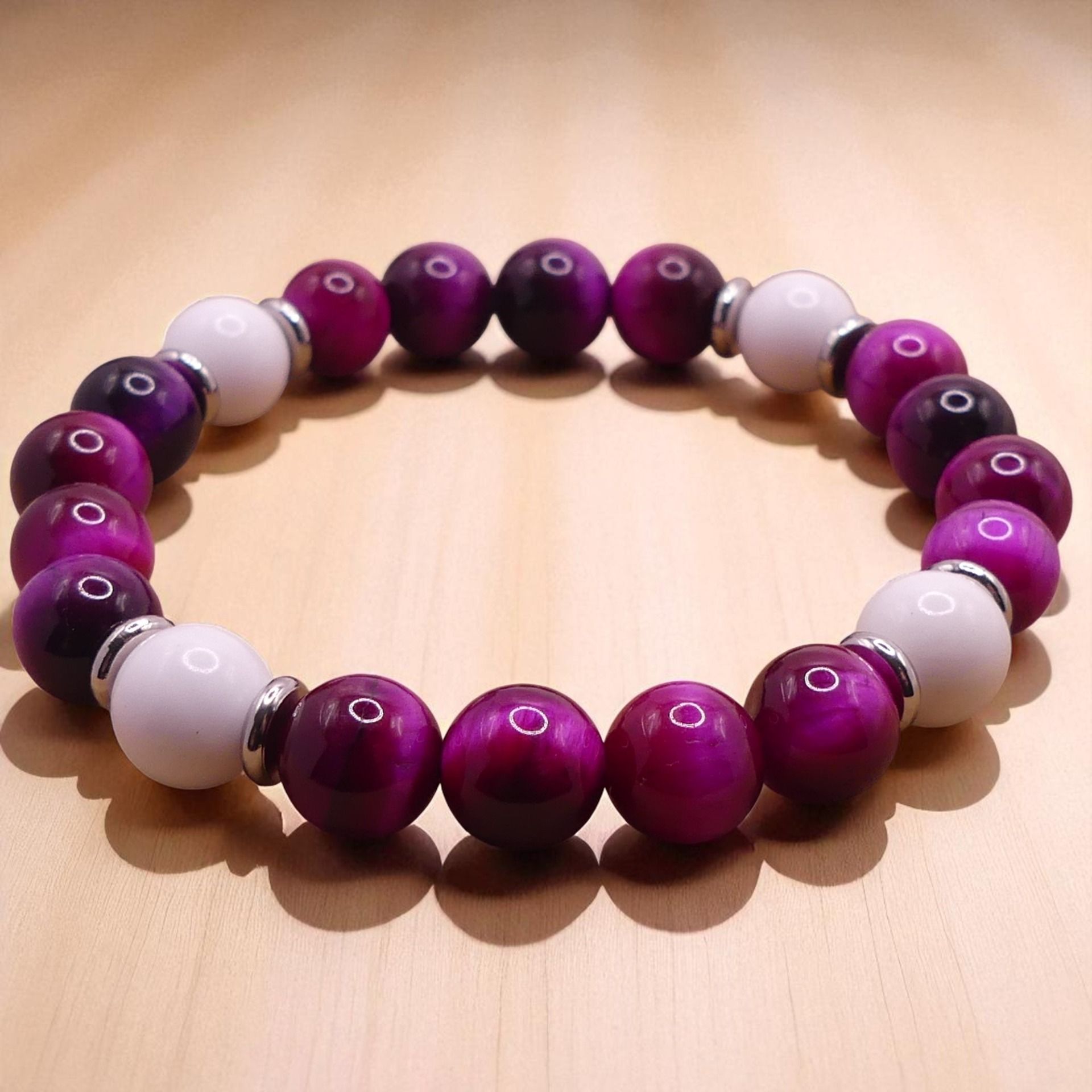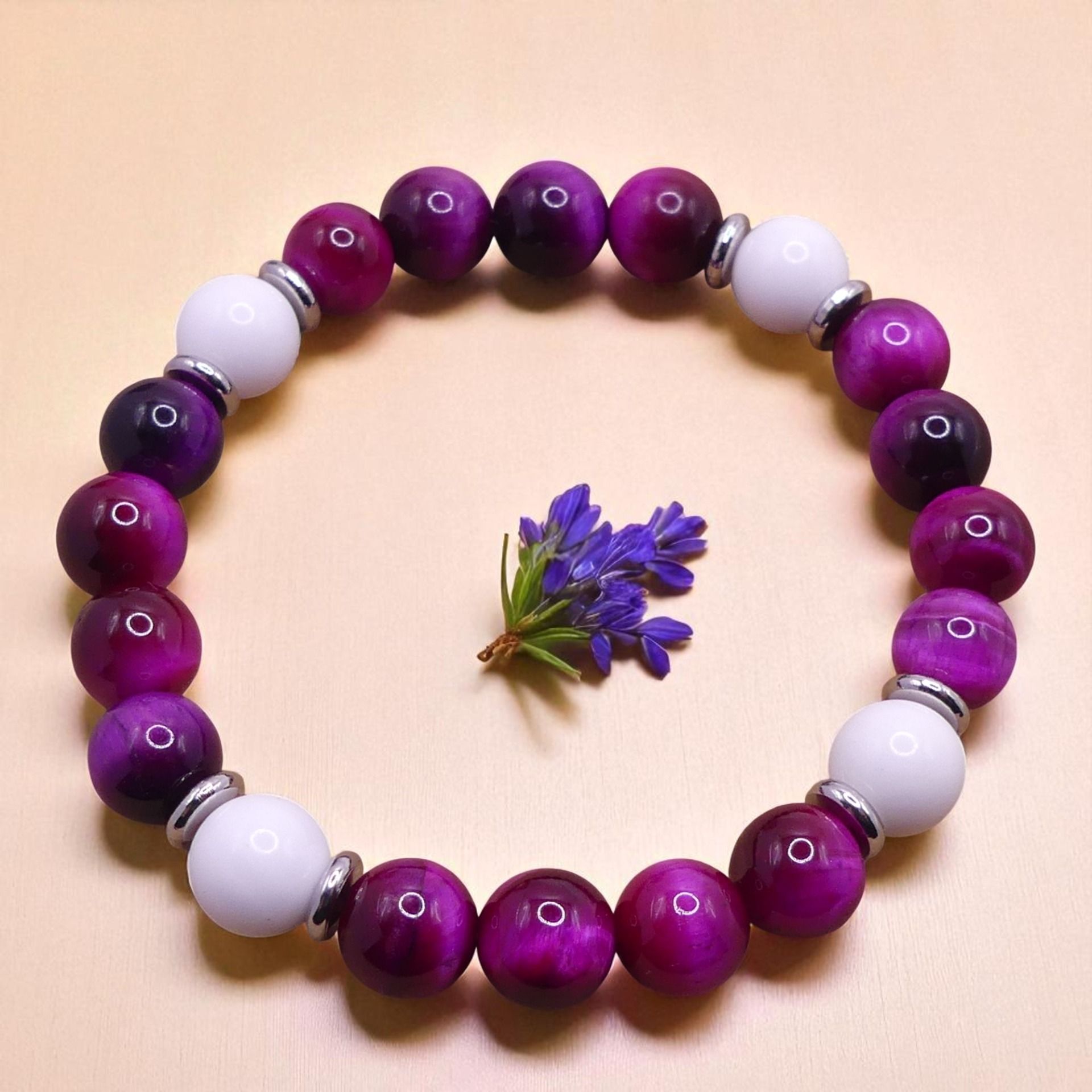L’œil de tigre violet, aussi appelé œil de tigre pourpre, est une pierre qui combine les propriétés de l’œil de tigre avec celles de la couleur violette, souvent associée à la spiritualité et à la méditation. Il est réputé pour favoriser la clarté mentale, la concentration et l’intuition. Il peut également aider à équilibrer les émotions, à renforcer la confiance en soi et à stimuler la créativité.