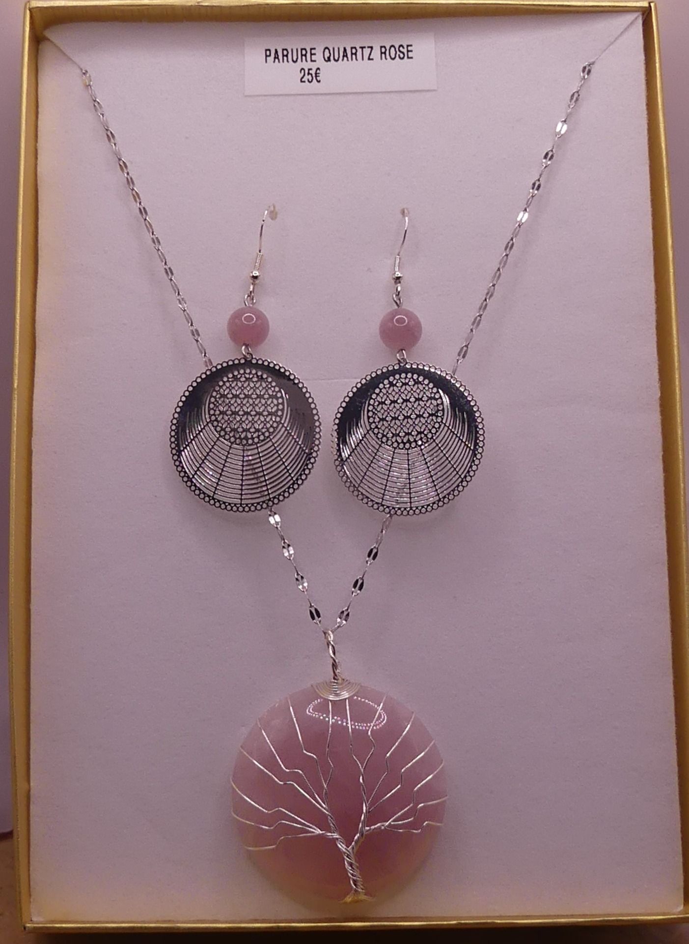 Succombez à cette parure composée de très élégantes boucles d'oreilles et d'un collier fabriqués à partir de pierre naturelle de Quartz Rose. Elles seront d'une aide précieuse pour apporter ses bienfaits tout au long de votre journée.